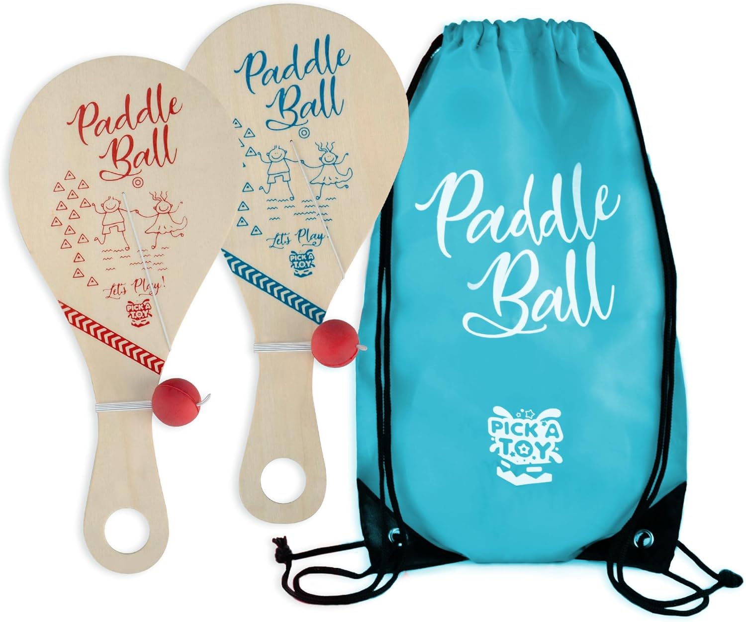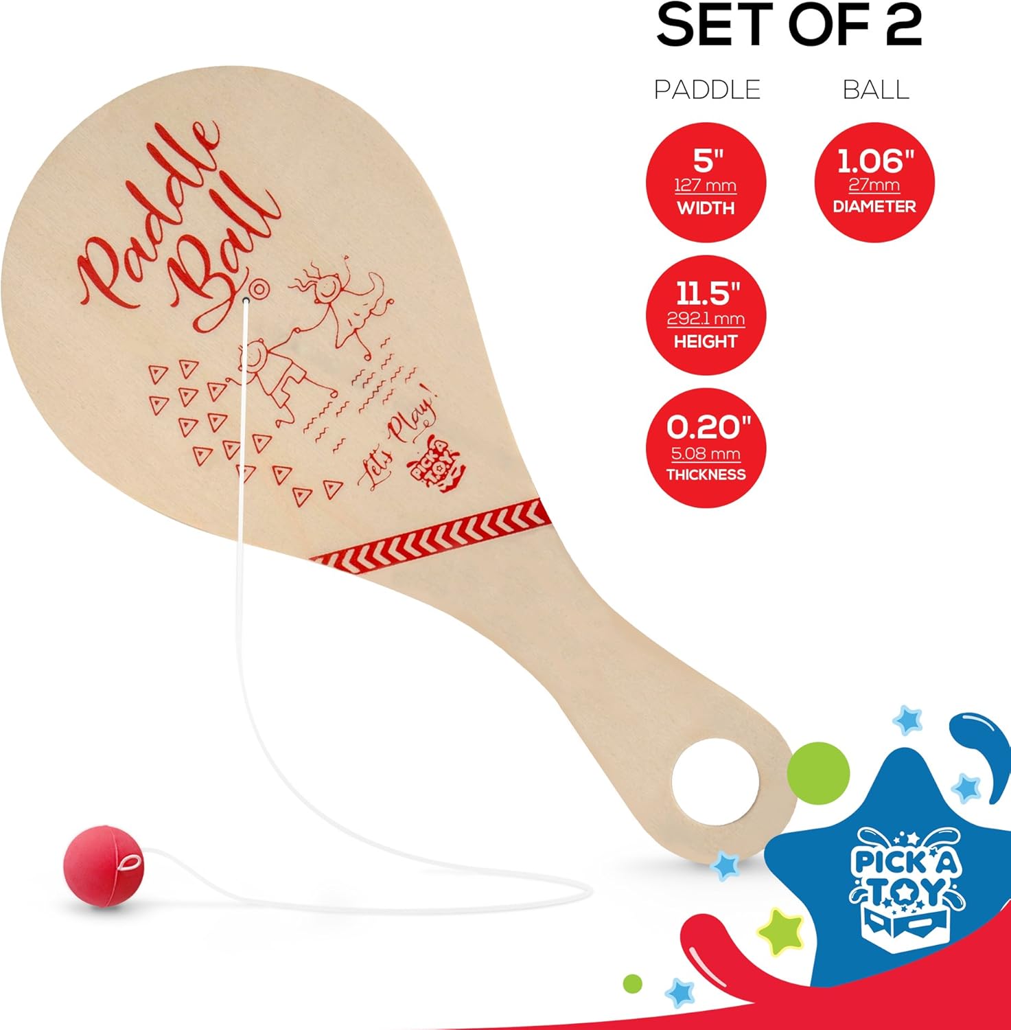 PICK A TOY Wooden Paddle Ball Toy(Set of 2) with Blue Carry Bag - Indoor Outdoor Toy: Fun and Classic Paddleball Game for Boys and Girls, Party Favor Toys Ages 4+